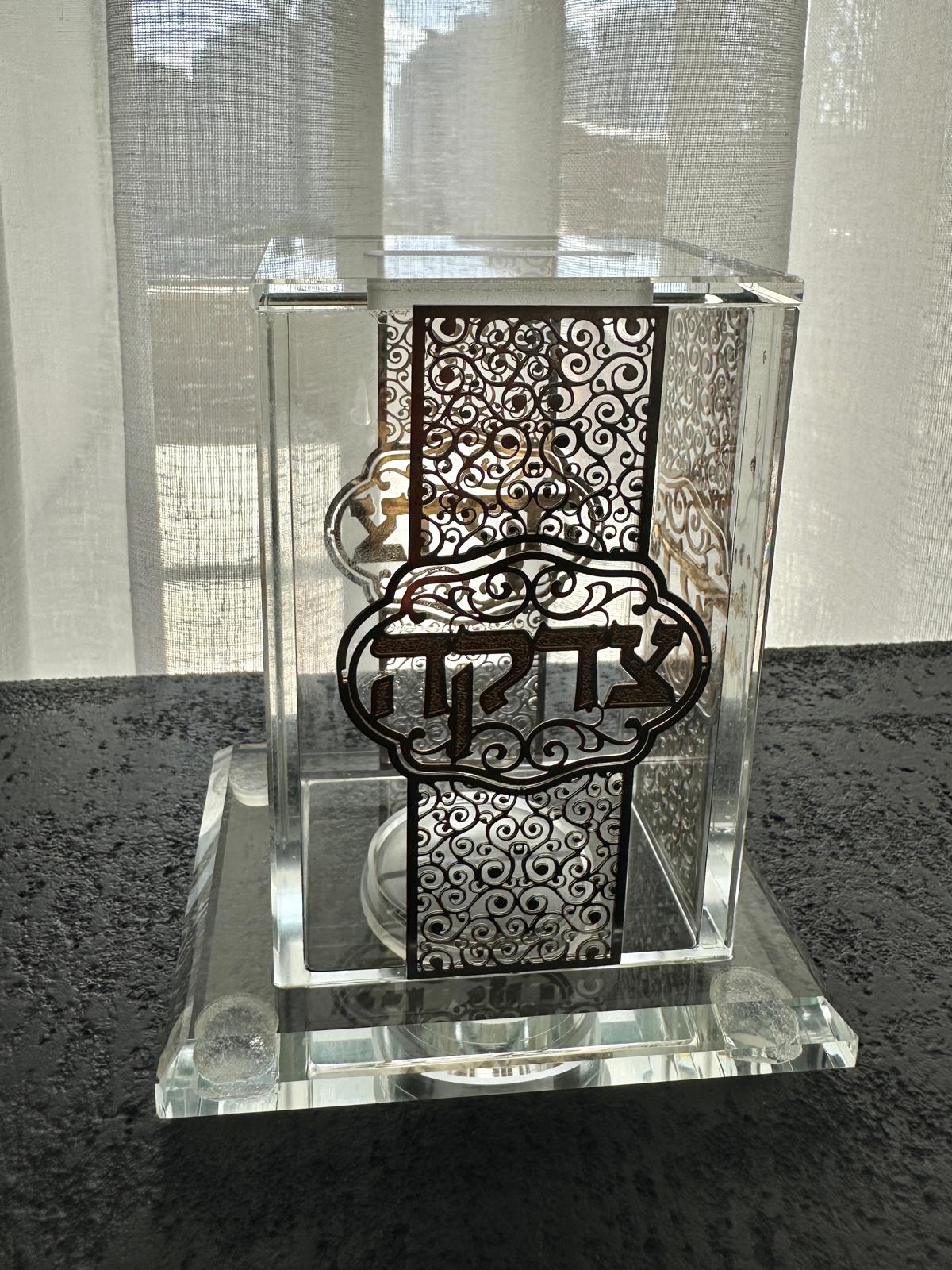 קופת צדקה מקריסטל ” עיטורים ” , גובה 12 ס”מ .