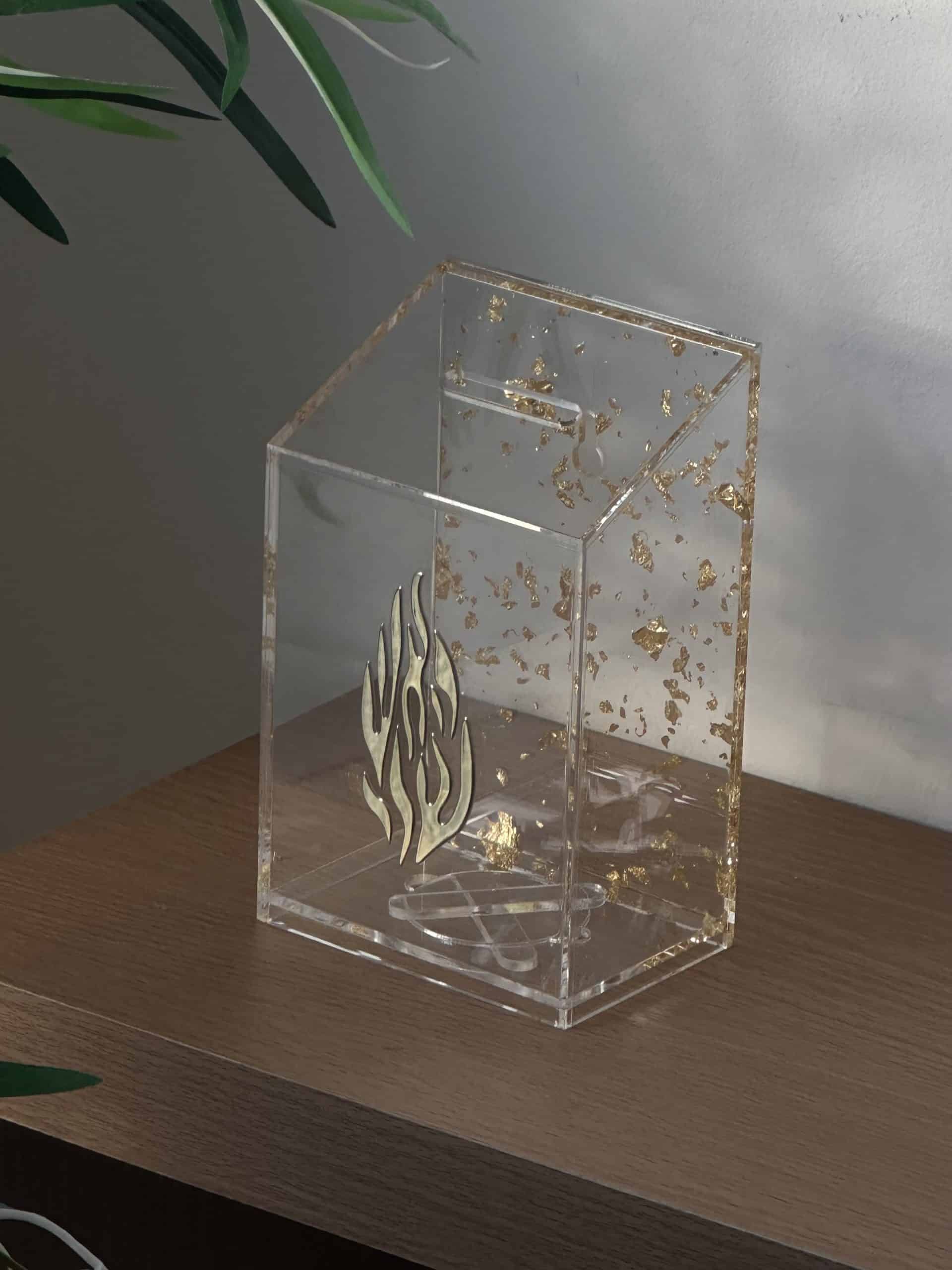 קופת צדקה פרספקס נצנצים זהב ״ האש שלי ״ , גובה 14 ס”מ .