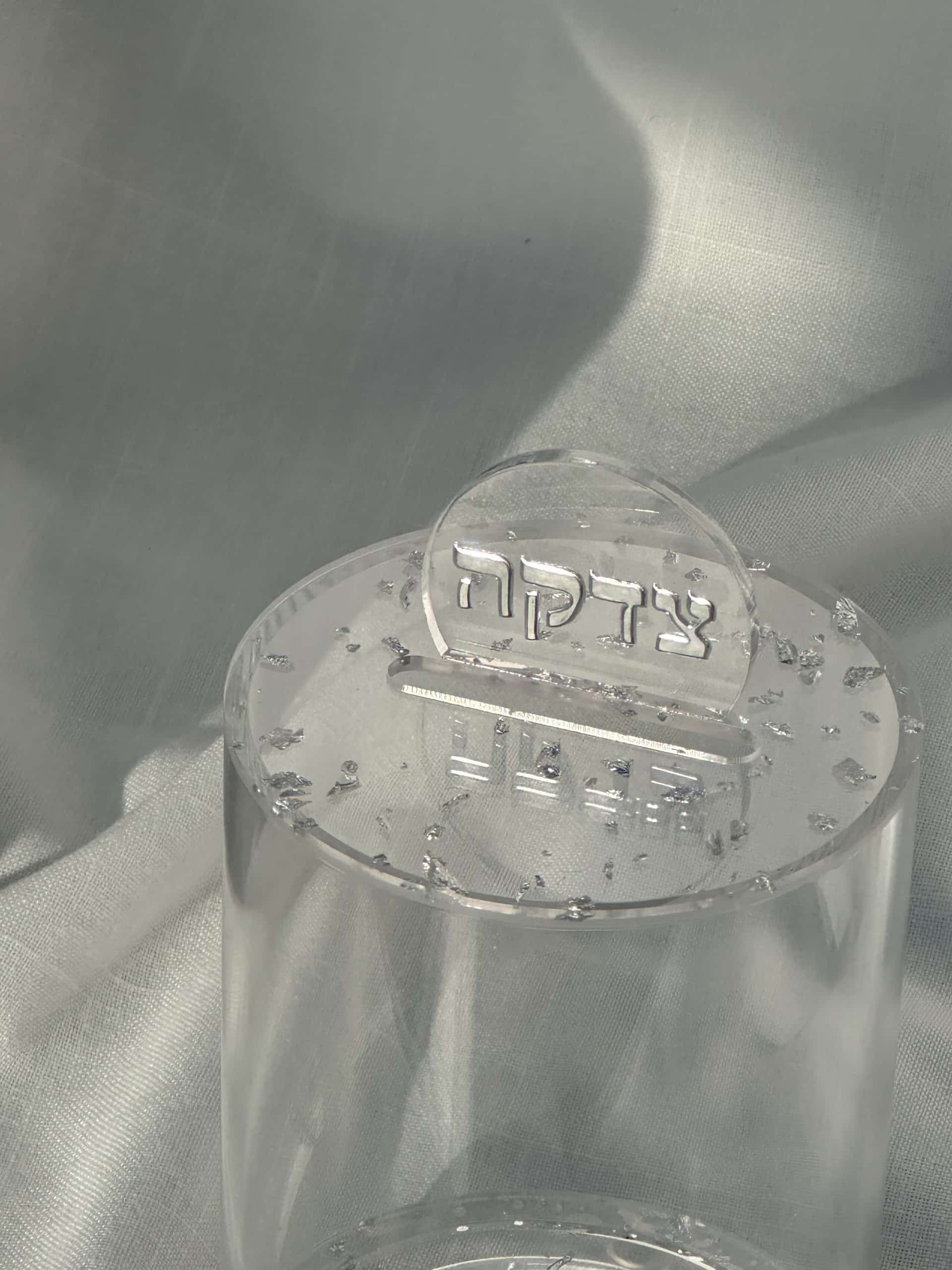 קופת צדקה פרספקס נצנצים כסף , גובה 16 ס”מ .