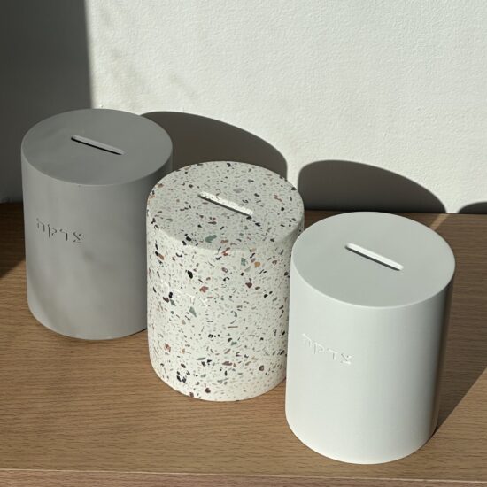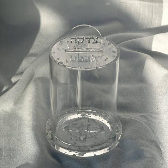 קופת צדקה פרספקס נצנצים כסף , גובה 16 ס”מ .