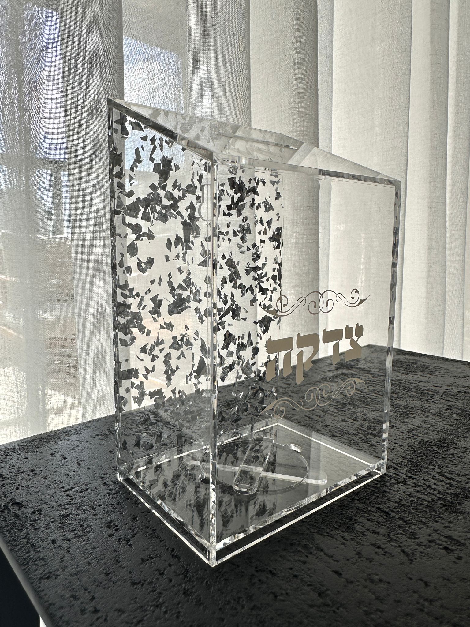דף הבית » מוצרים » קופת צדקה פרספקס נצנצים – כסף