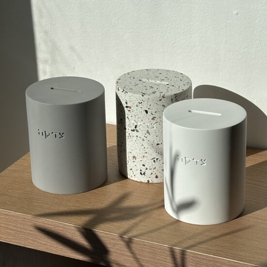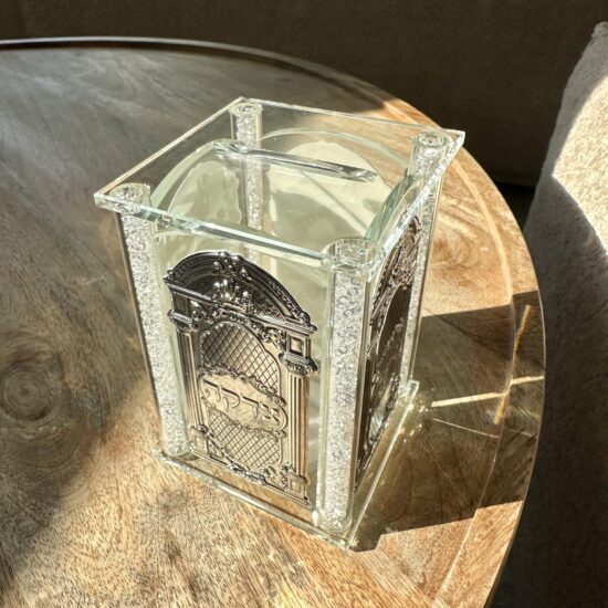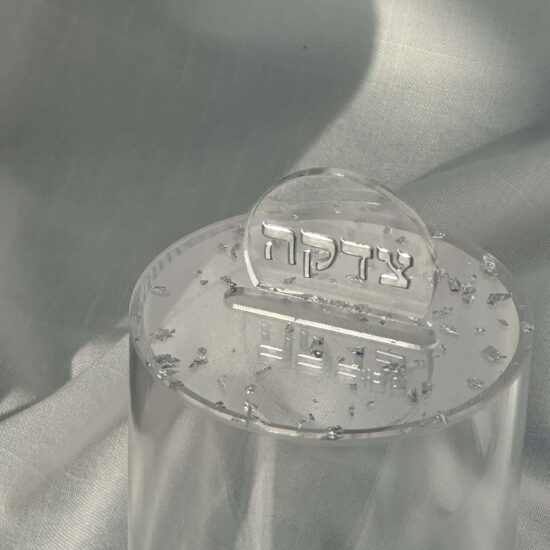 קופת צדקה פרספקס נצנצים כסף , גובה 16 ס”מ .
