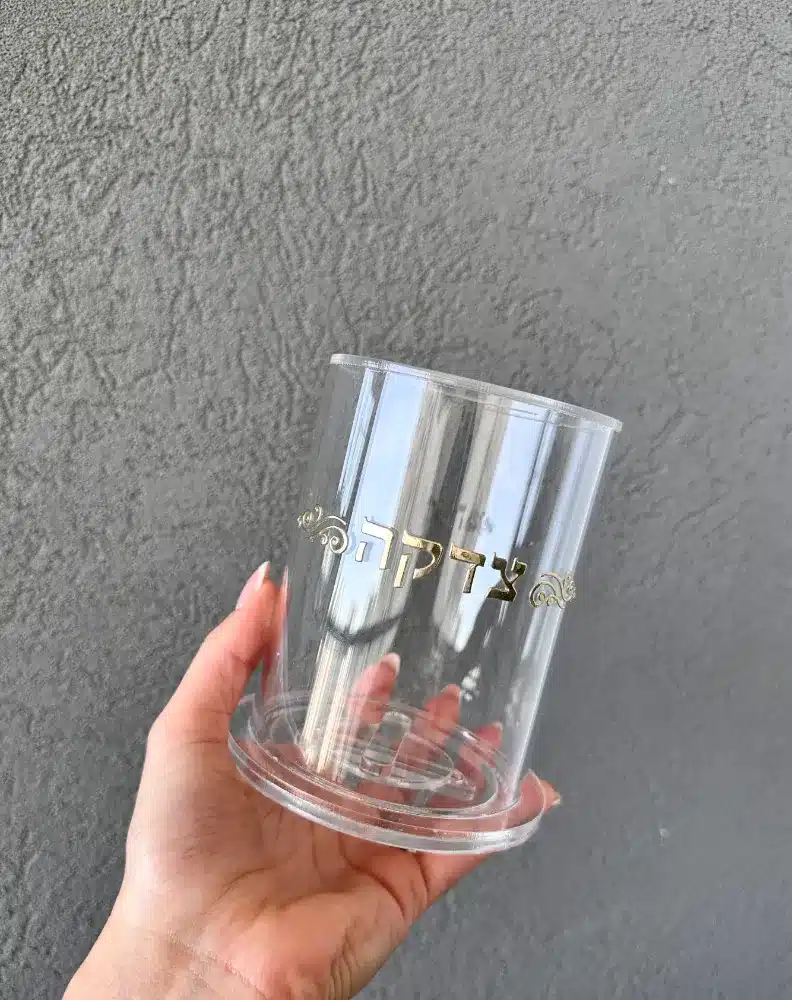 קופת צדקה שקופה , גובה 12.5 ס”מ .