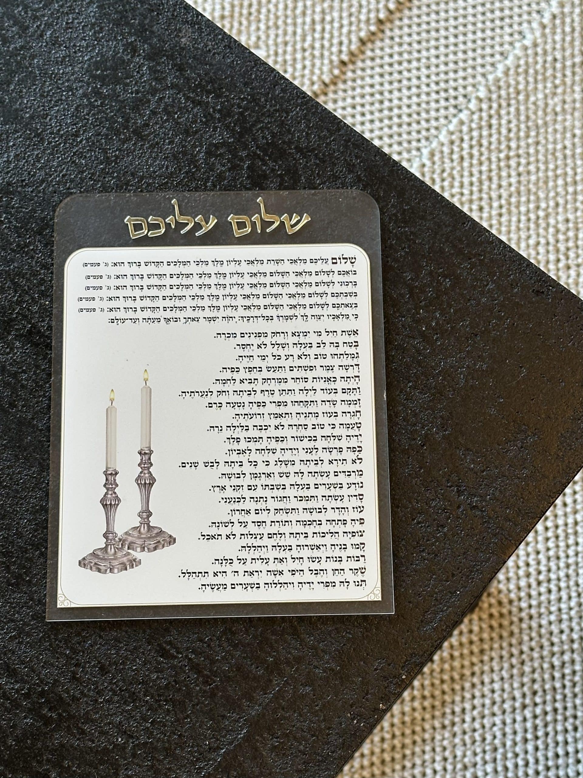 שלום עליכם מפרספקס , נוסח עדות המזרח , אורך 20 ס״מ , רוחב 15 ס״מ .